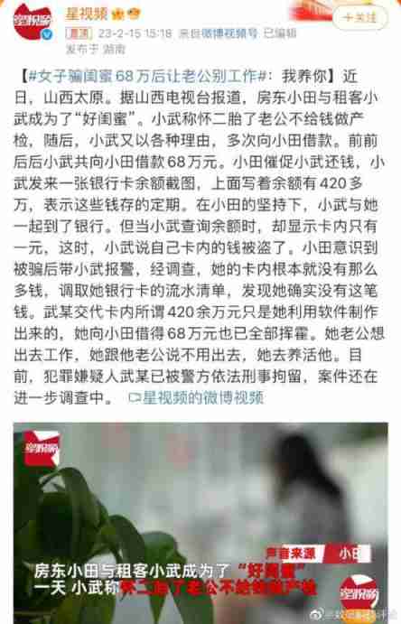 女子骗闺蜜68万后让老公别工作!!!